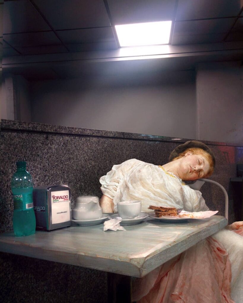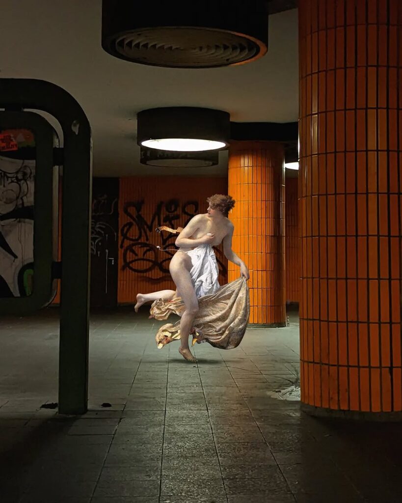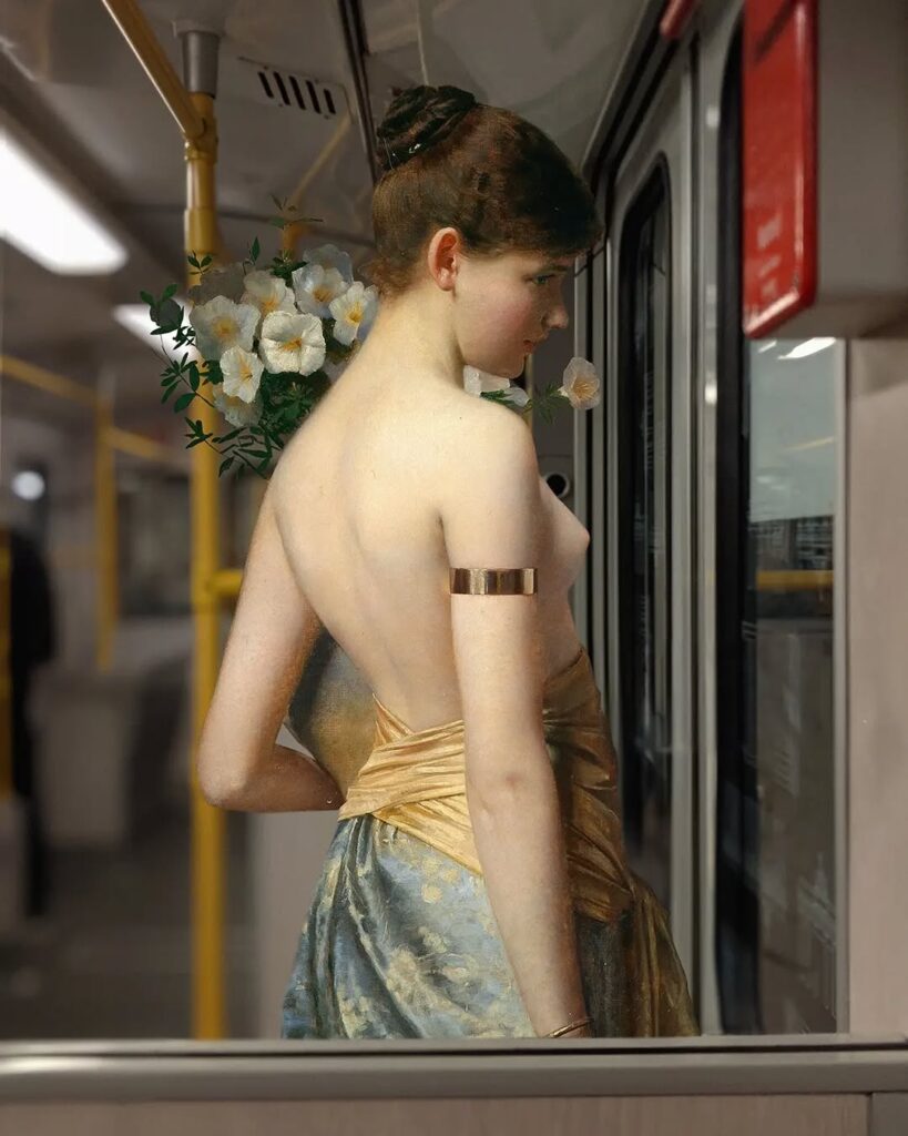 Su método es sencillo solo en apariencia. Consiste en hacer chocar los códigos de la pintura clásica ,ese universo de “alta cultura”, de dioses, vírgenes y gestos heroicos, con los escenarios más corrientes de la vida urbana: el metro, una parada de autobús, un callejón anodino, un coche compartido. De ese contraste nace una visión del arte del pasado convertido en una lente para mirar el presente, y, a la vez, el presente convertido en un espejo que descompone los mitos de la antigüedad.